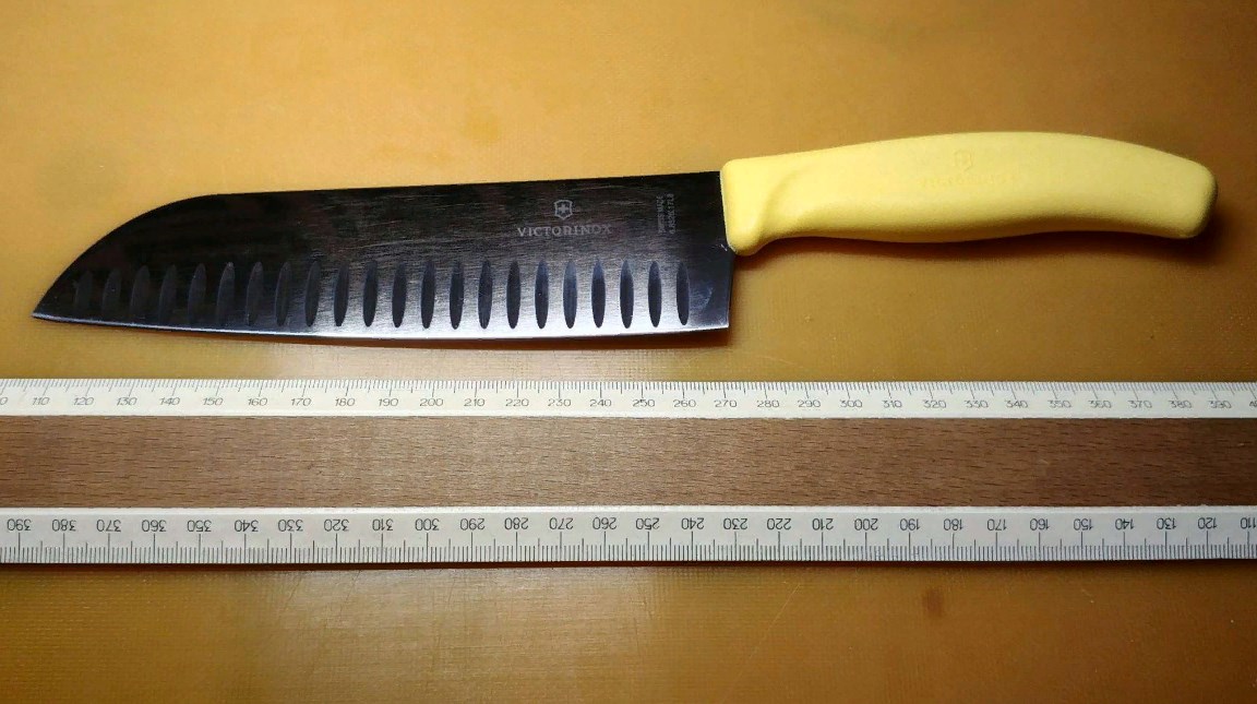 Длина лезвия - 17 см. Его особенность - очень широкое лезвие. Такому поддается и большой продукт. Например, можно целый и ровный кружок у вареной колб..